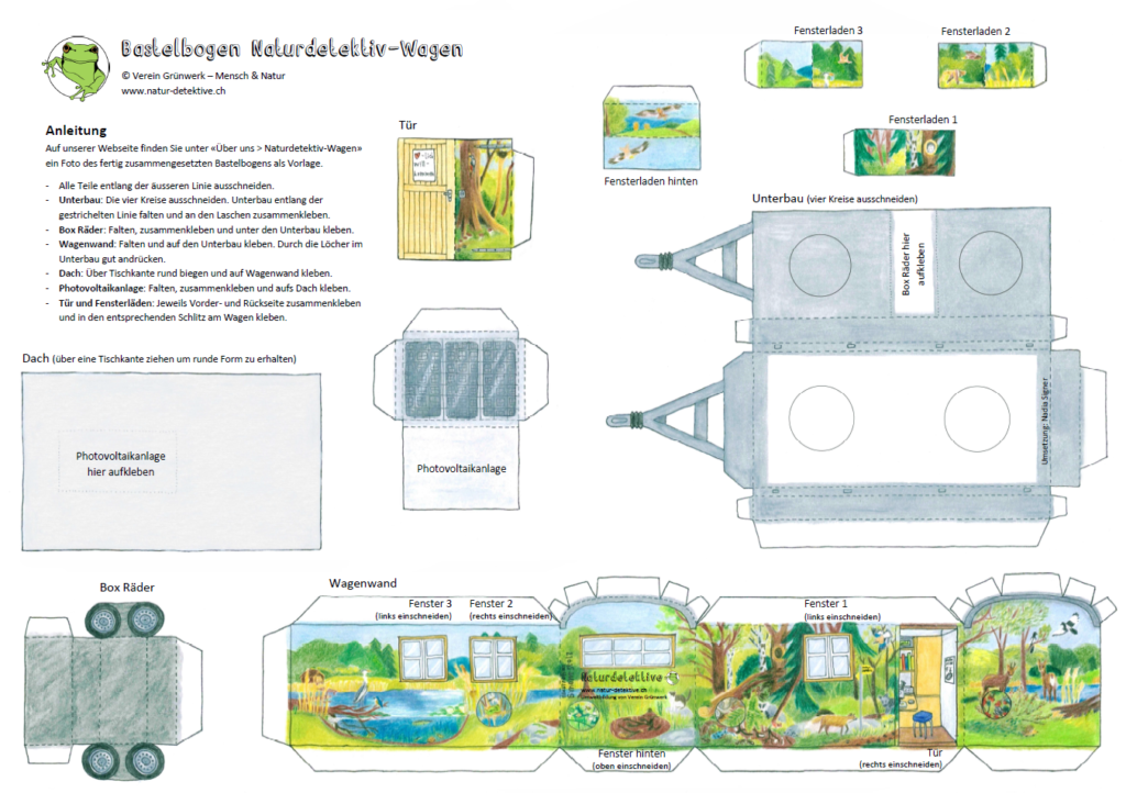 Mit einem Drucker, einer Schere und etwas Leim kommt der Naturdetektiv-Wagen als Miniversion zu euch! Den Bastelbogen könnt ihr hier herunterladen und auf festes A3-Papier ausdrucken.